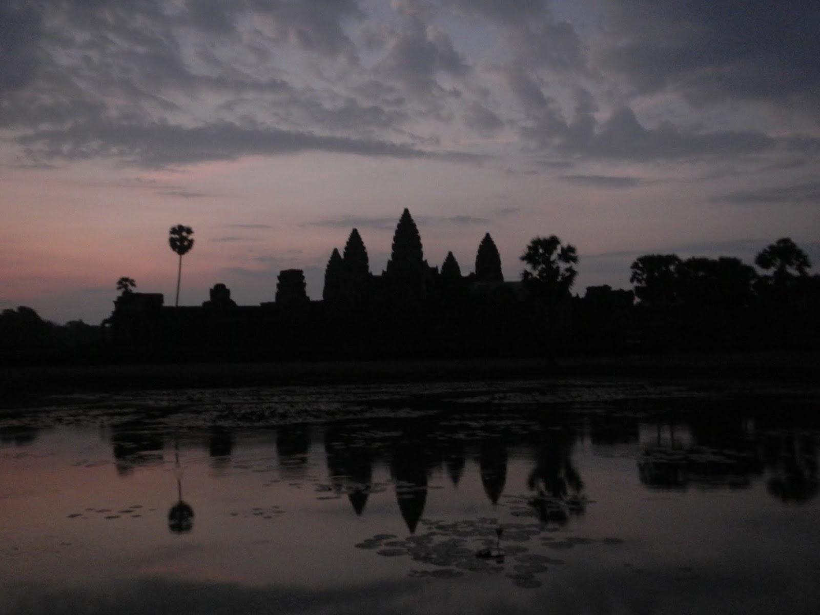 Then, it was the big day! We awoke at 4 am so we could meet our driver at 4:45. He whisked us to Angkor Wat, where it was still so dark we could barely see the outline of the towers. Our driver had suggested we stand just in front of the reflecting pool to watch sunrise, but it was so dark that we couldn't tell what was water and what wasn't. Our first attempt at entering the temple was blocked by a group of white-robed worshipers kneeling at the front entryway. (We later realized that entrance was closed for construction anyway).